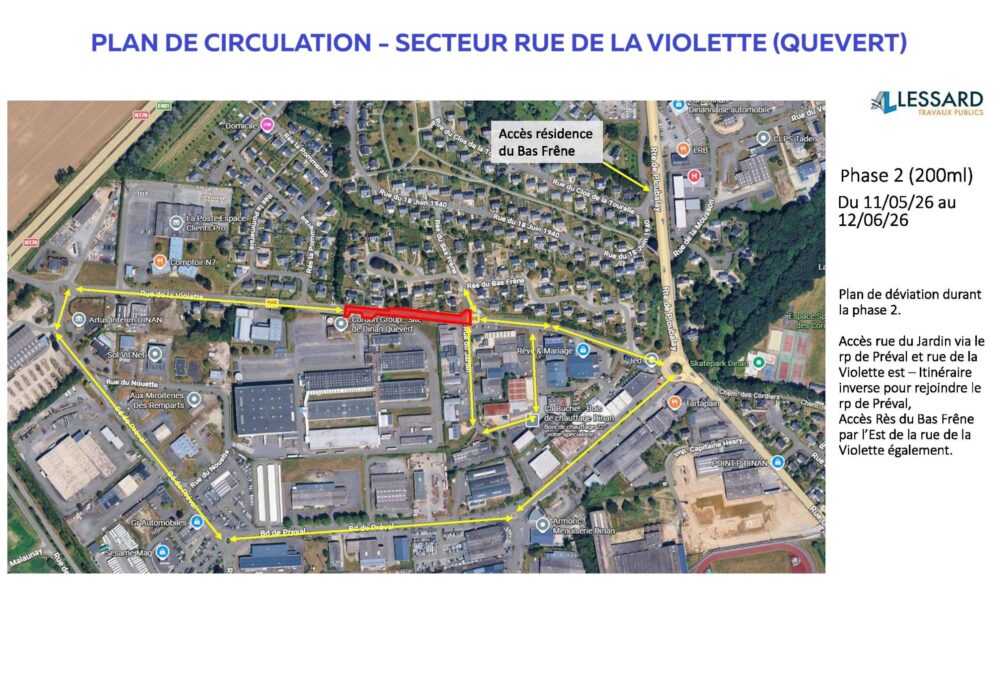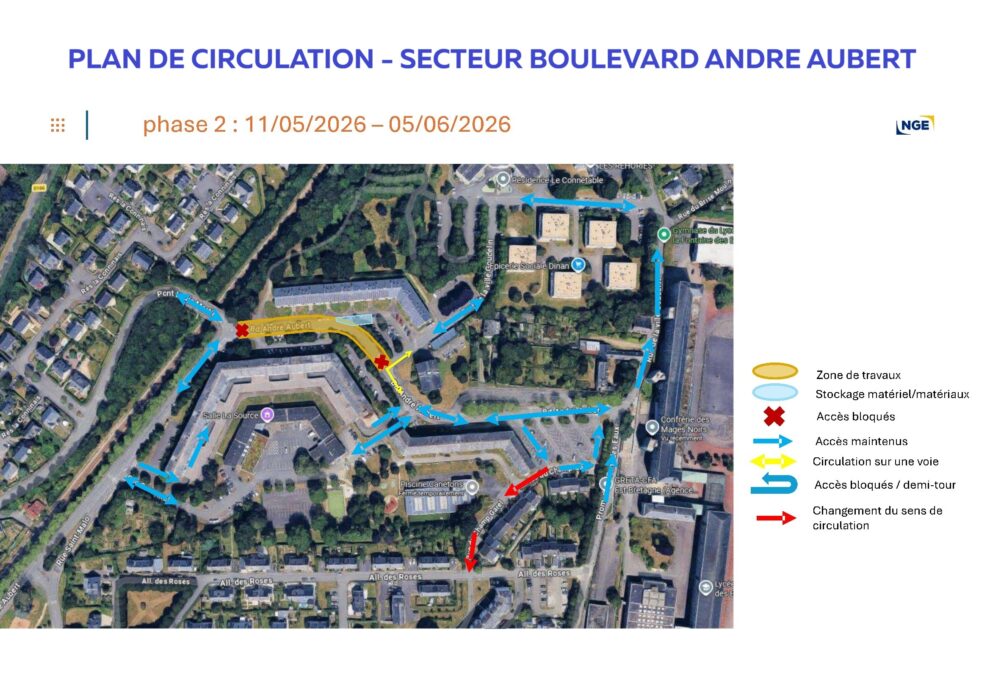 Du 30 mars au 8 mai puis du 11 mai au 5 juin : mise en place de déviations, circulation adaptée selon les phases du chantier, accès maintenu aux habitations et aux équipement (dont le lycée de la Fontaine des Eaux).